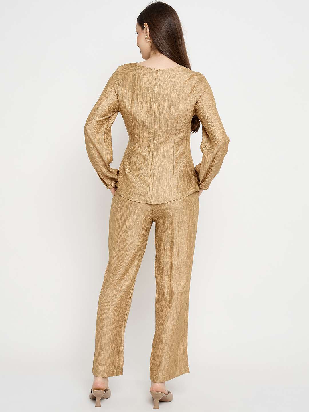 Made for days that call for elegance, this golden coord set features a playful tie-knot top and straight-fit bottoms, a blend of charm and flair for any casual outing.