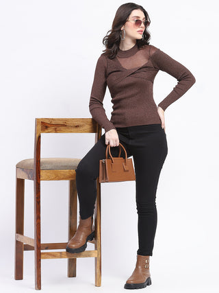 Madame Shimmery Mock Neck Wrap Brown Sweater