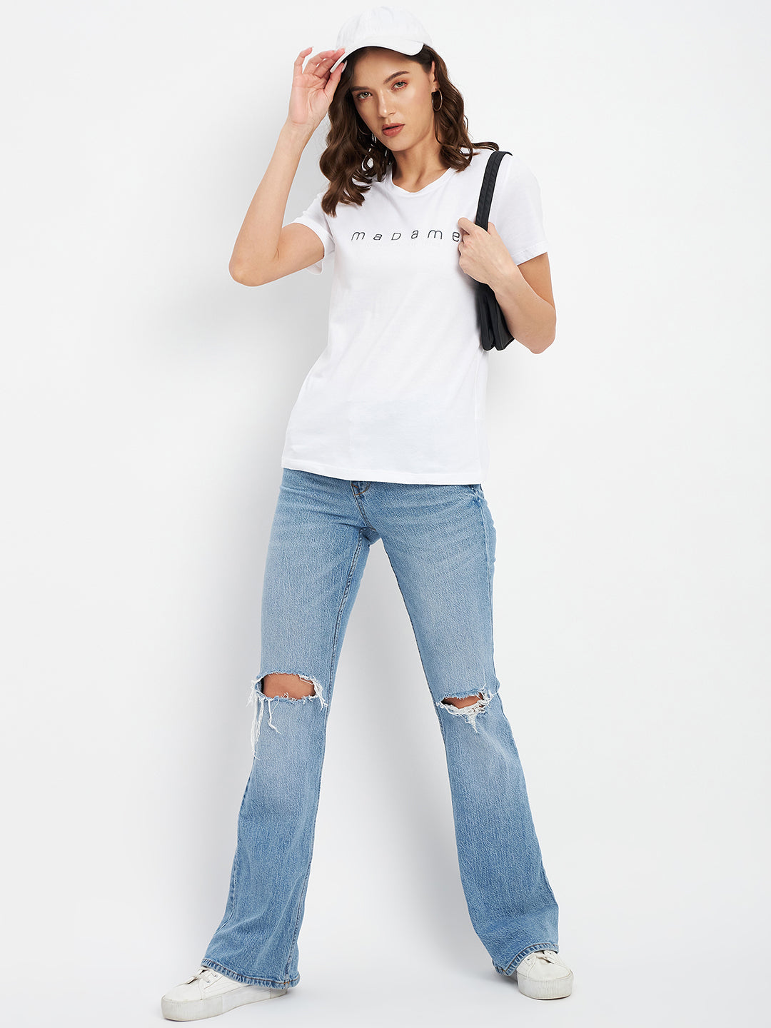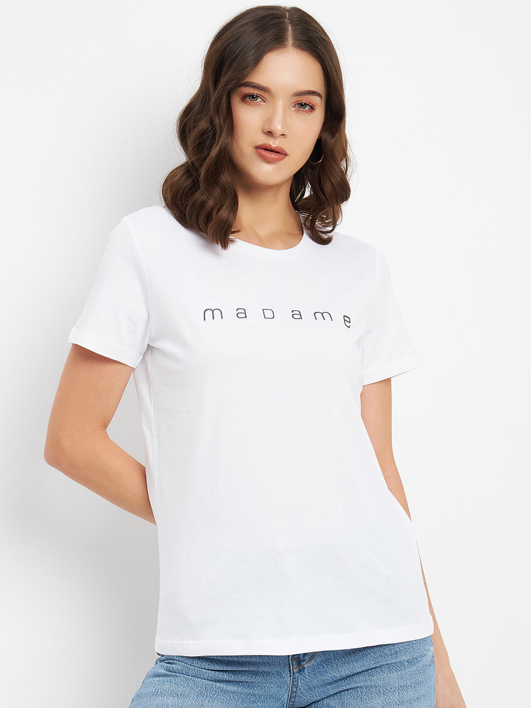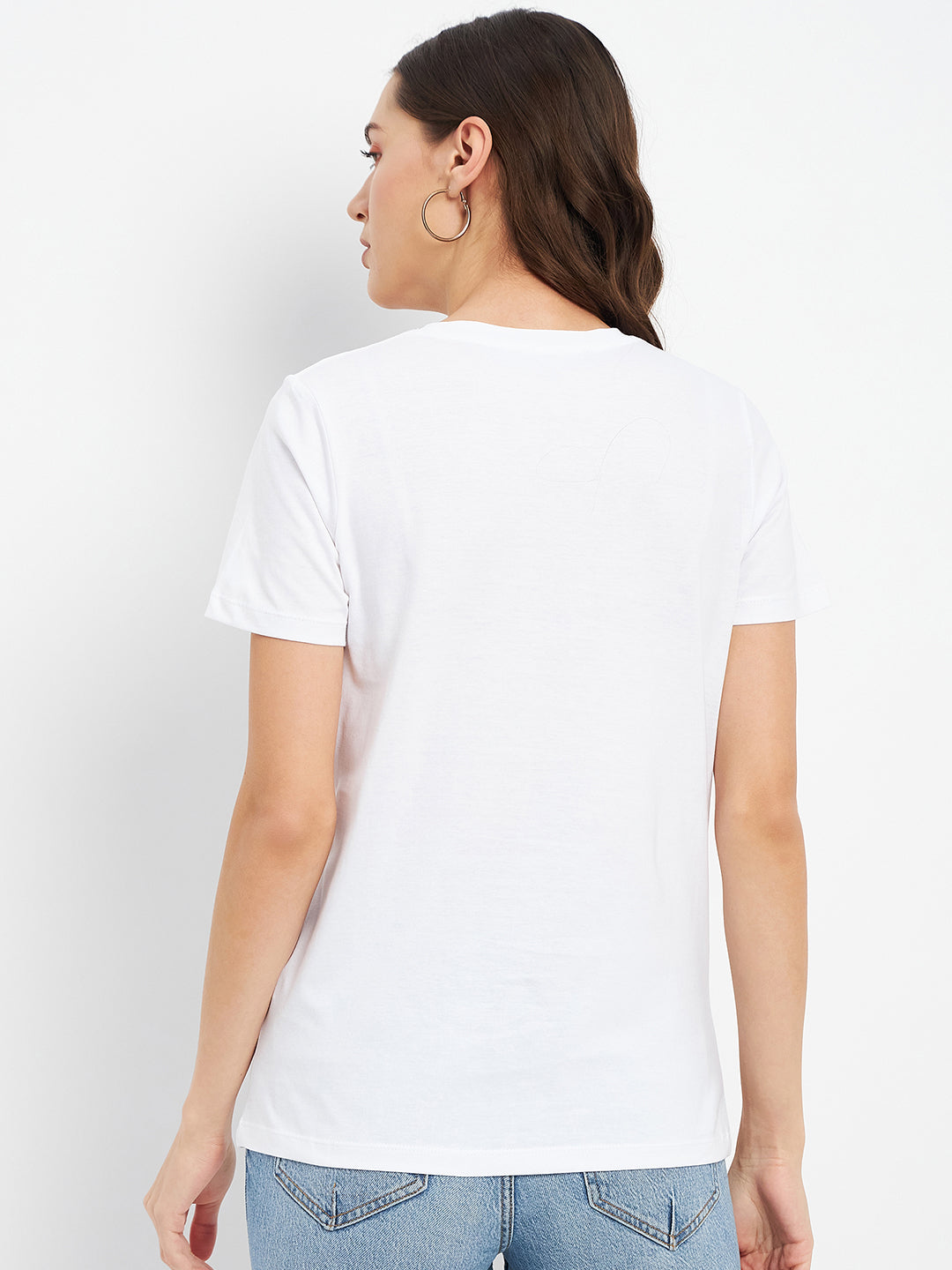 Make a classic statement with this white t-shirt for women. A super comfy and casual summer cotton t-shirt that comes with a round neckline and regular half sleeves. The subtle typography accentuates the overall look giving this women's t-shirt a cool summer vibe. Pair it with slim fit blue jeans and heels to create a posh statement.