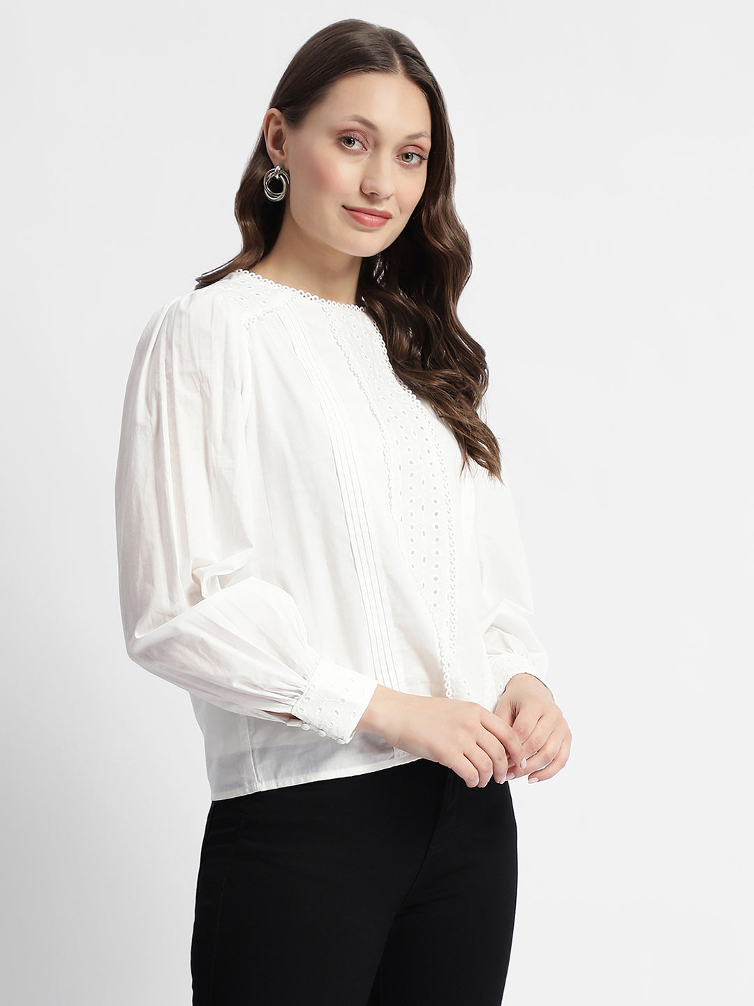 Embrace the casual elegance with our Casual Full Sleeve White Top. Crafted in crisp white, this versatile top is perfect for sunny days and warm evenings. It features puffed cuff sleeves and lacework at the neckline. Effortlessly versatile, it transitions seamlessly from day to night, whether you're at the office or out for cocktails with friends. Pair it with tailored pants for a sleek professional look, or with denim and statement jewellery for a laid-back yet polished ensemble.