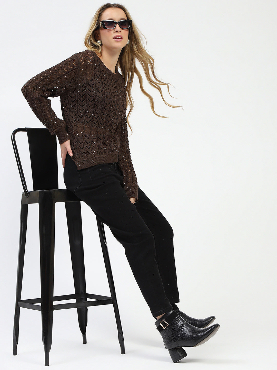 A style that will quickly become a staple in your wardrobe. This cozy knitted top features a rich coffee-brown hue that adds a warm touch to any outfit. The crew neck design offers a classic silhouette, while the cuffed full sleeves provide a trendy twist, ensuring you stay fashionable and comfortable. The soft knit fabric drapes beautifully, allowing easy movement and a flattering fit. Plus, the cuffed sleeves add a bit of structure, making it easy to roll them up for a more laid-back vibe or keep them down for a polished look.