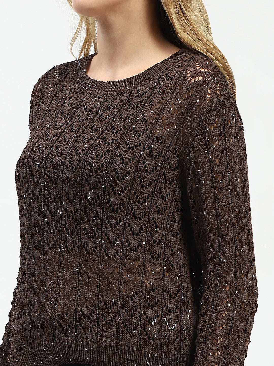 Madame Shimmer Detailed Crochet Crew Neck Knitted Coffee Brown Top