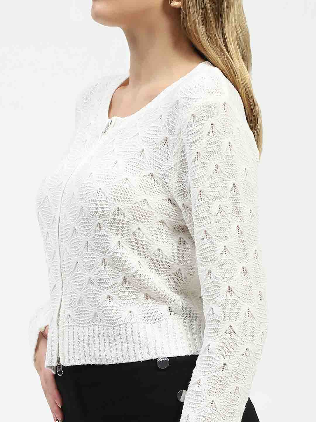 Madame Textured Round Neck Zip Up Off White Knit Top