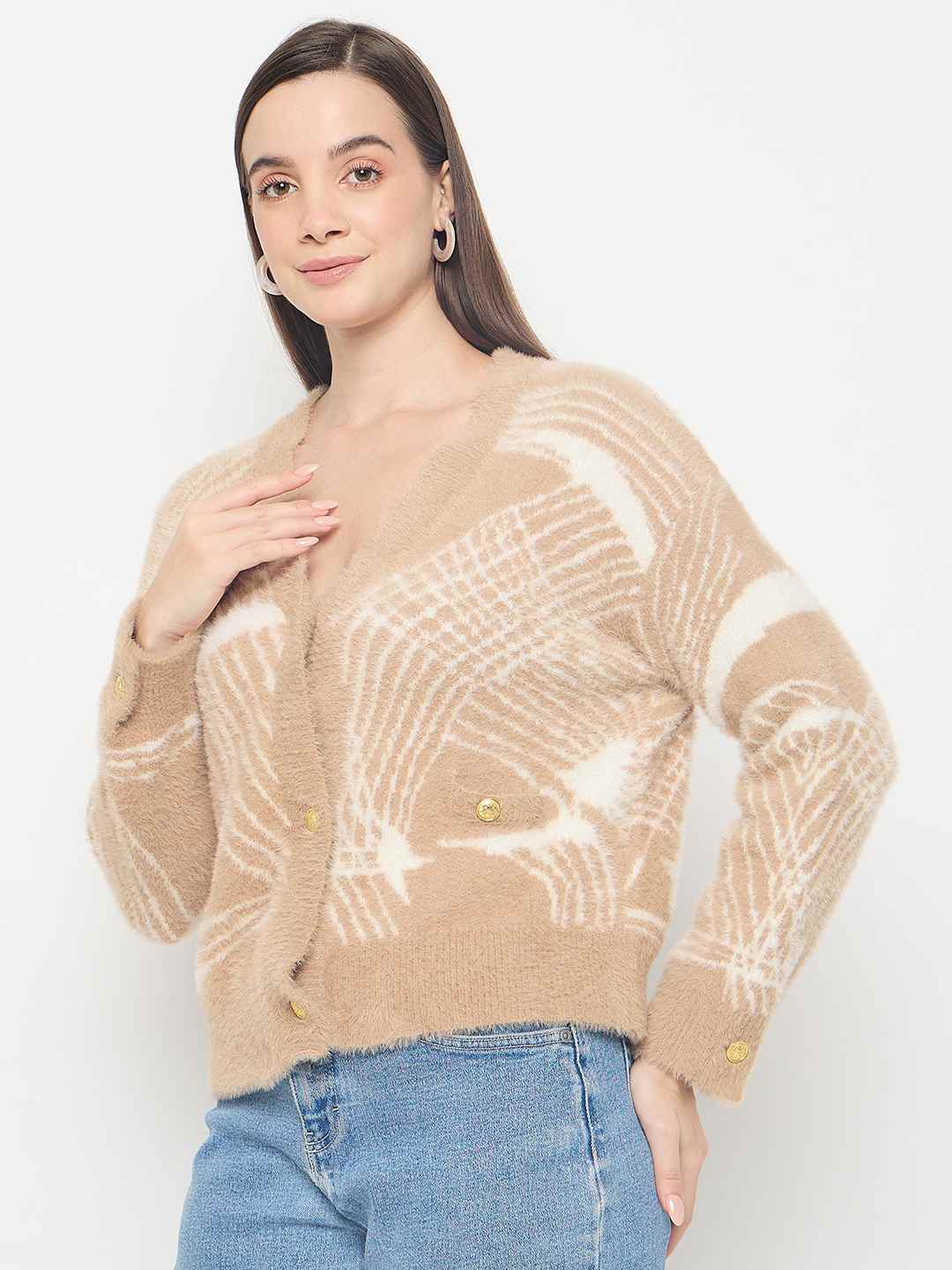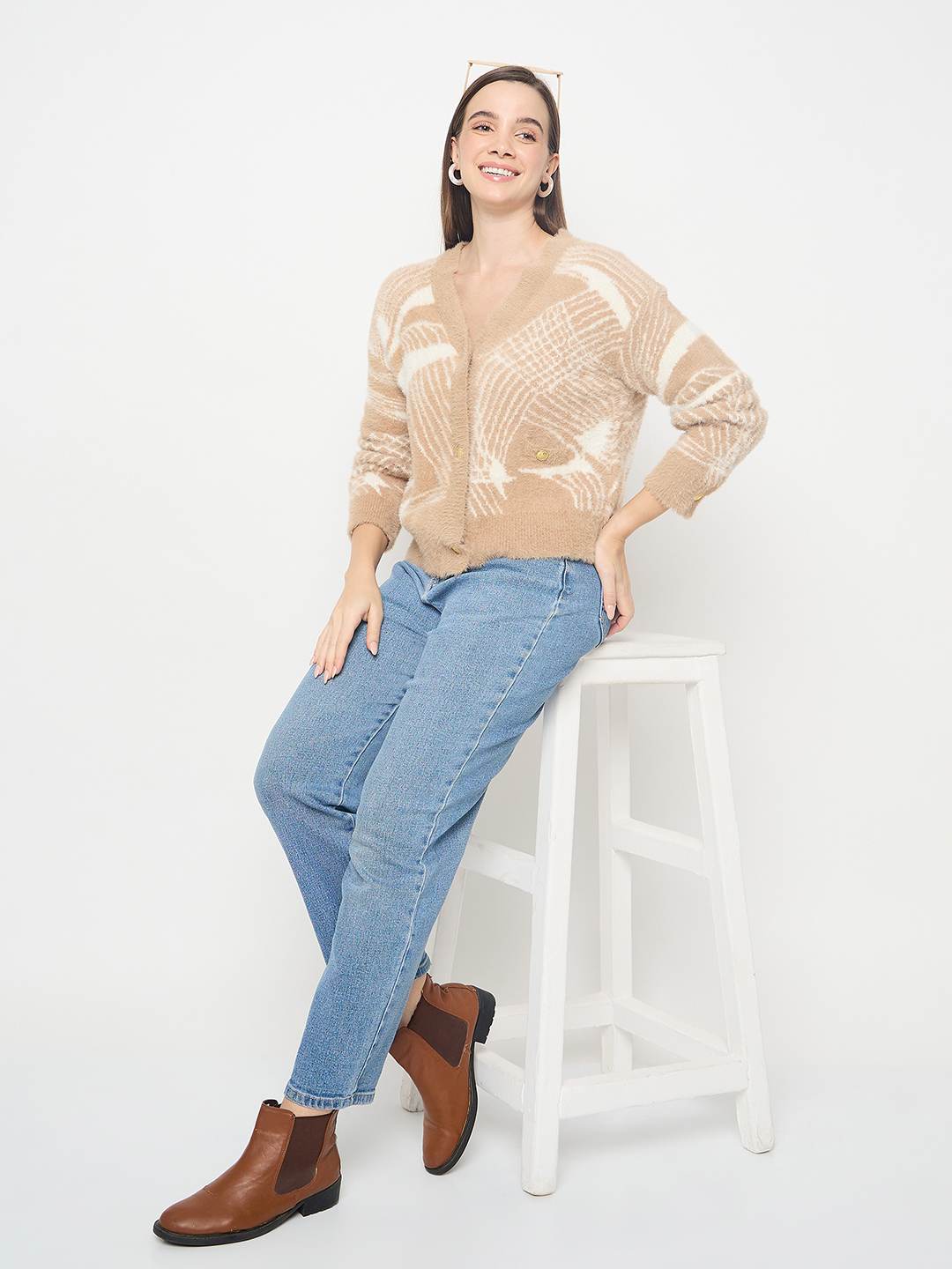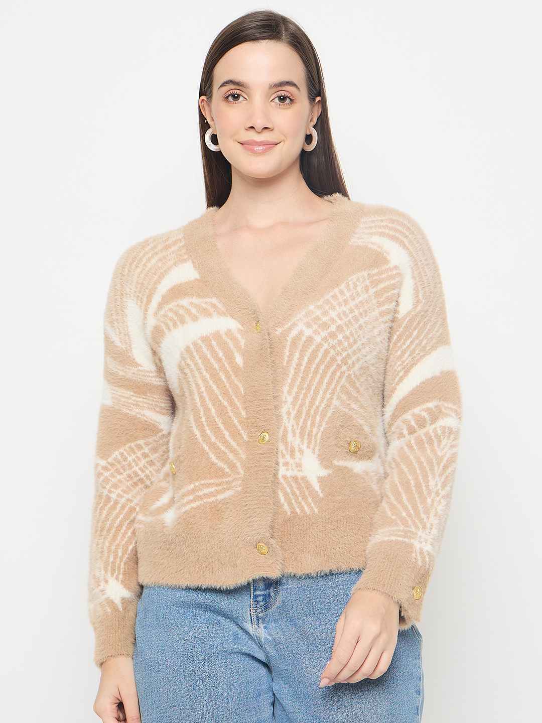 Madame Abstract Print Button Up Camel Brown Sweater