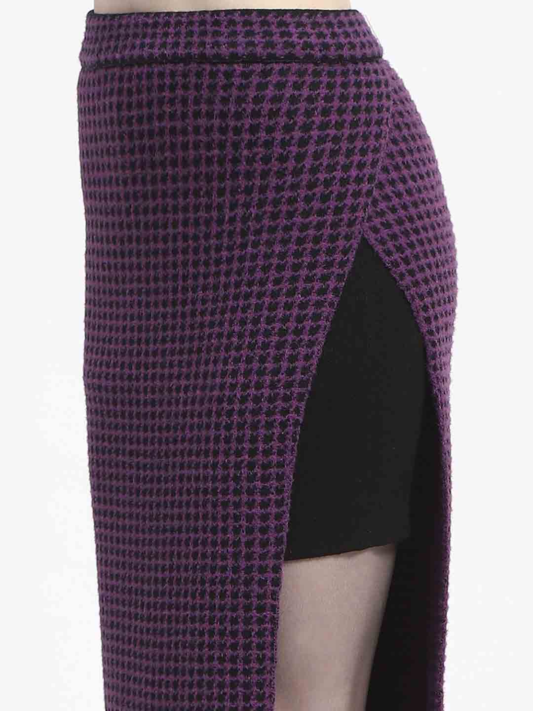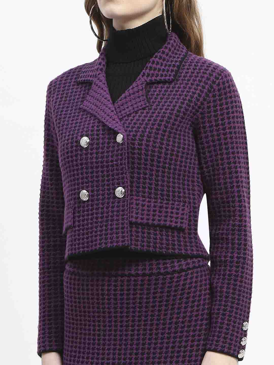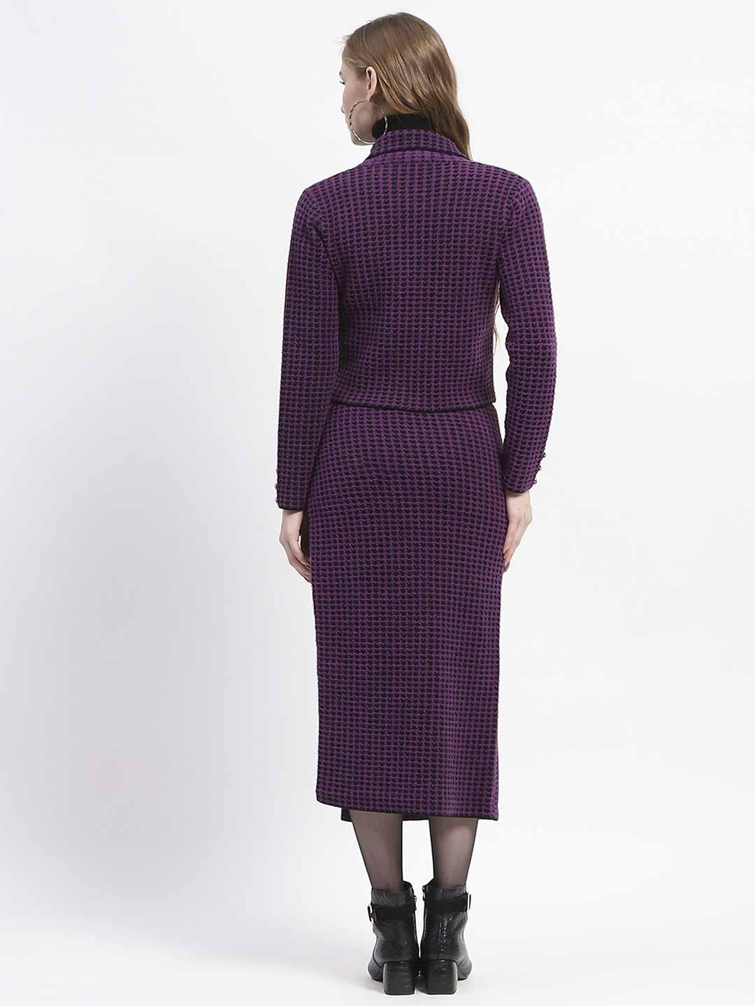 Crafted from high-quality fabric, this set features a striking black striped pattern that adds a touch of modern flair to a classic silhouette. The blazer is designed with a flattering double-breasted front, adorned with gold buttons for a luxurious touch. It also features a structured fit with a slightly cropped length, creating a sleek and tailored look that enhances your figure. The matching skirt offers a streamlined, pencil fit that falls just below the knee, balancing the ensemble with elegance and sophistication. This set is versatile and can be worn together for a coordinated look or separately to mix and match with other pieces in your wardrobe. Whether you're heading to a business meeting or a formal event, this purple striped blazer and skirt set will ensure you stand out with confidence and style.