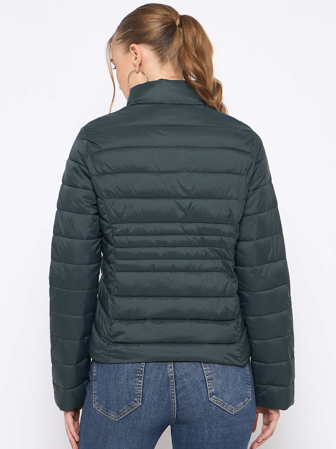 Stay warm and stylish in the quilted bottle green puffer jacket from Madame. Lightweight yet cozy, it’s perfect for layering over casual outfits, adding a vibrant pop of color and a trendy touch to your winter wardrobe.