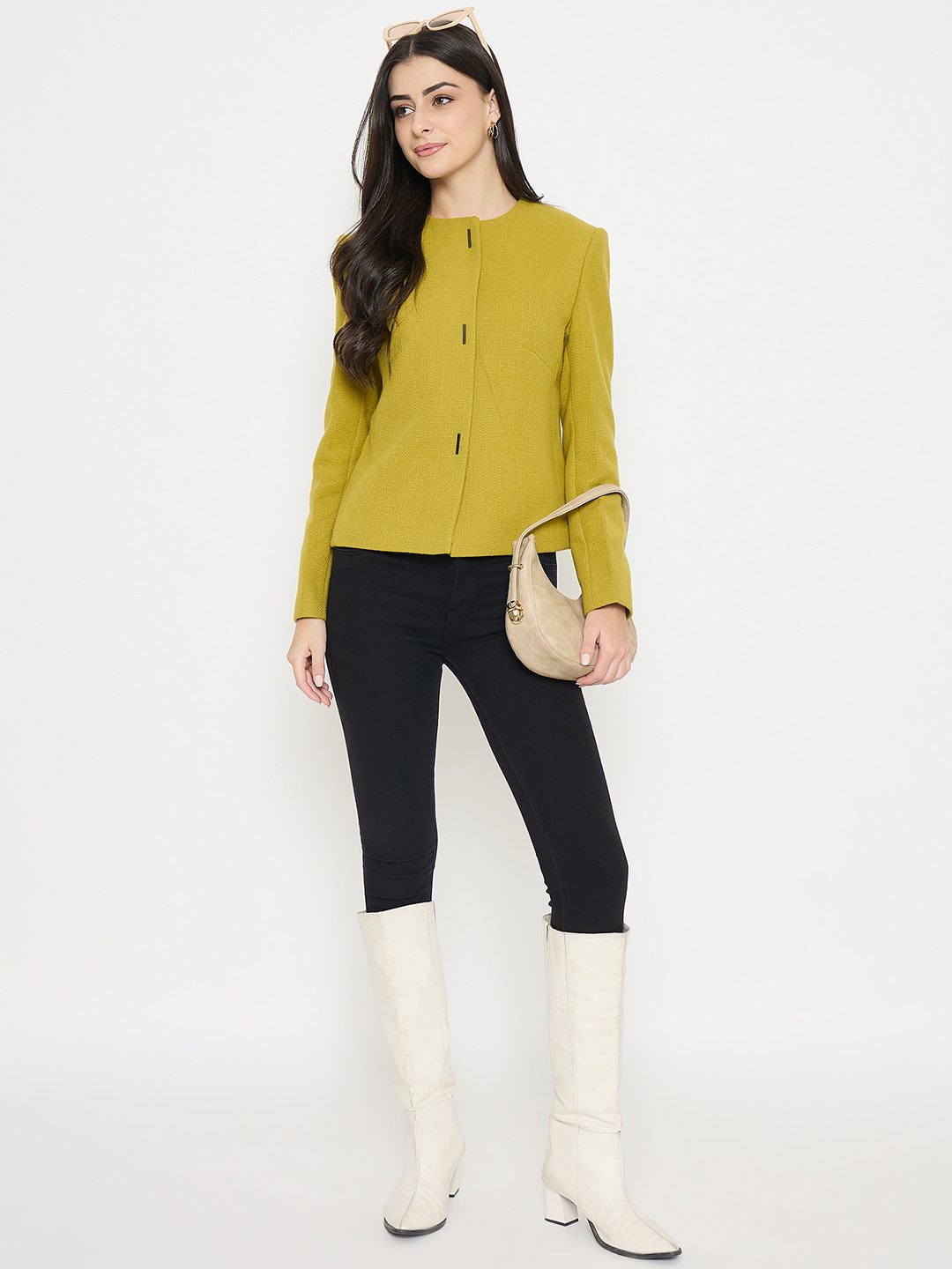 This green coat is crafted in a smooth rayon blend that delivers a fresh burst of color. It not only keeps your layering game on point, but its tailored fit and cropped length make it the perfect mix of playful and polished.