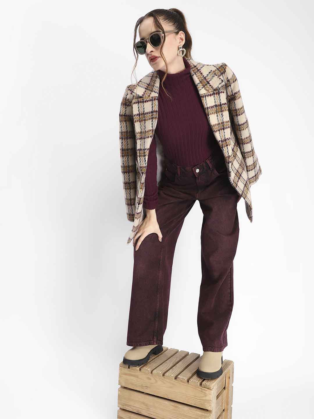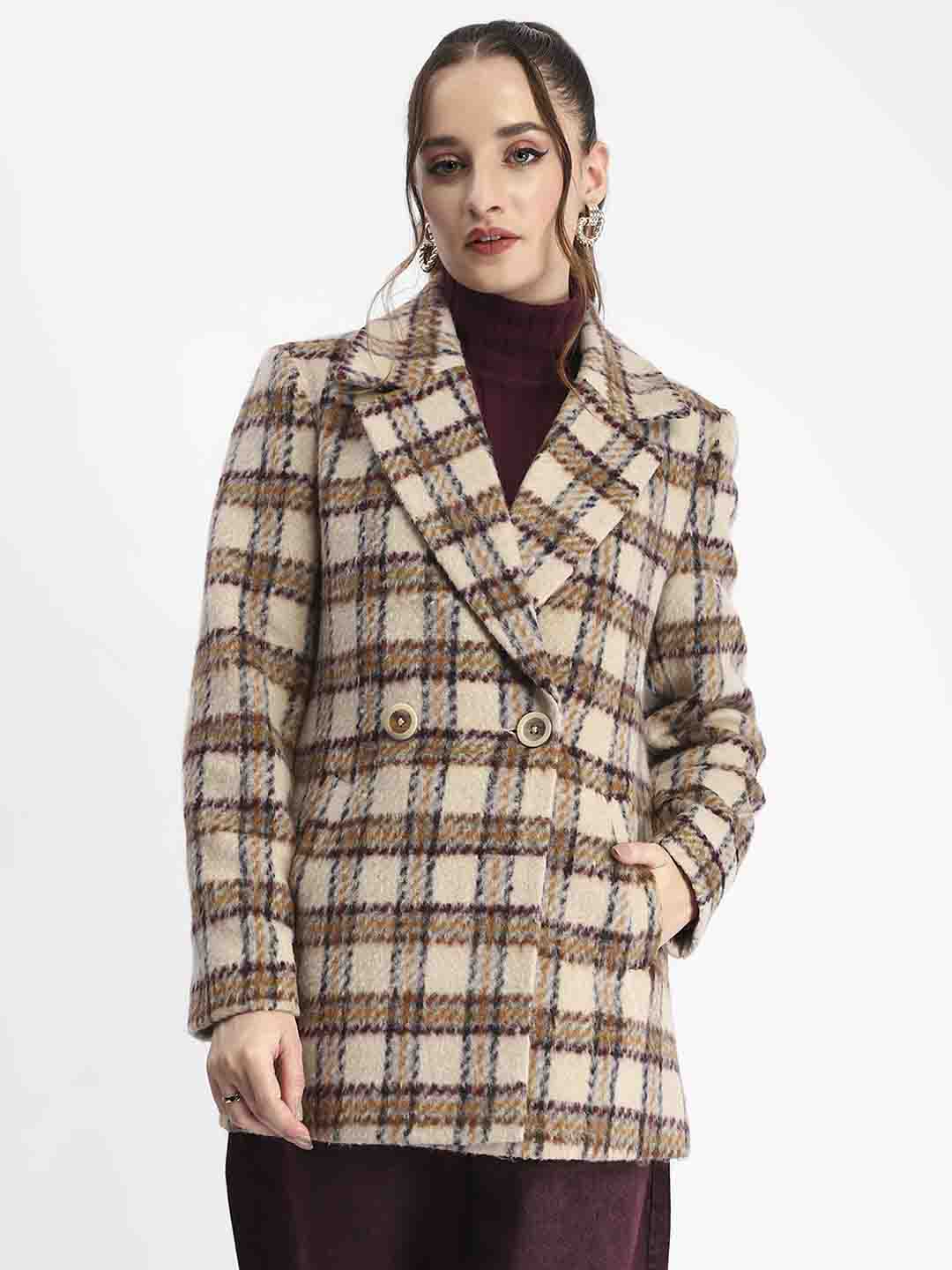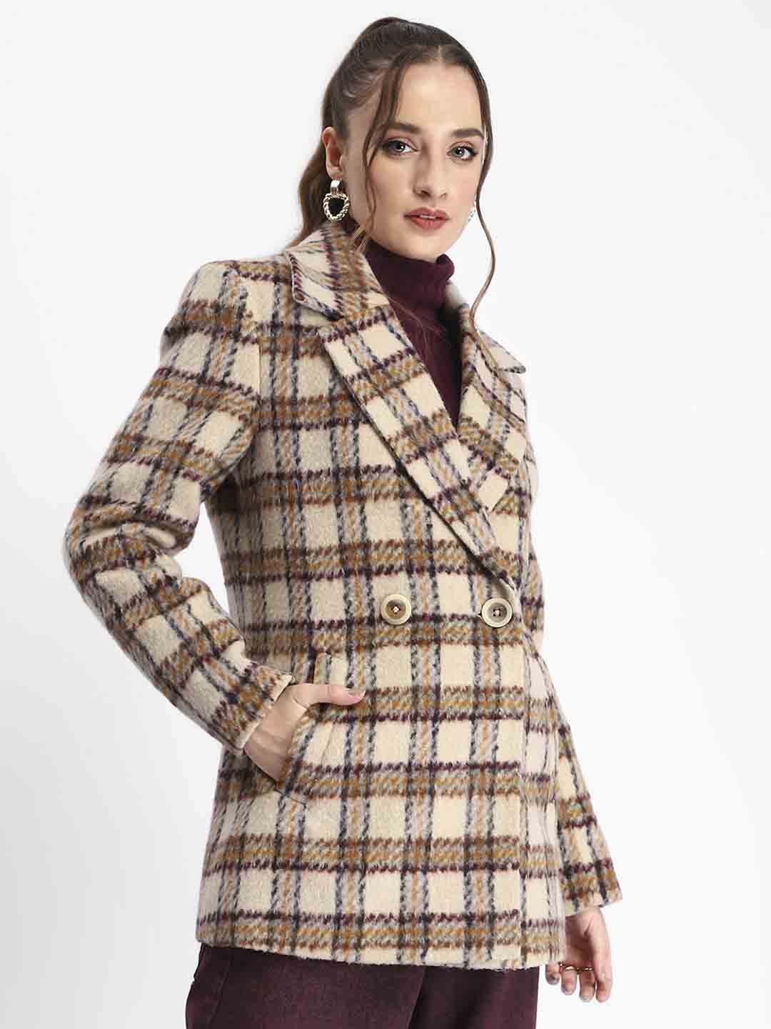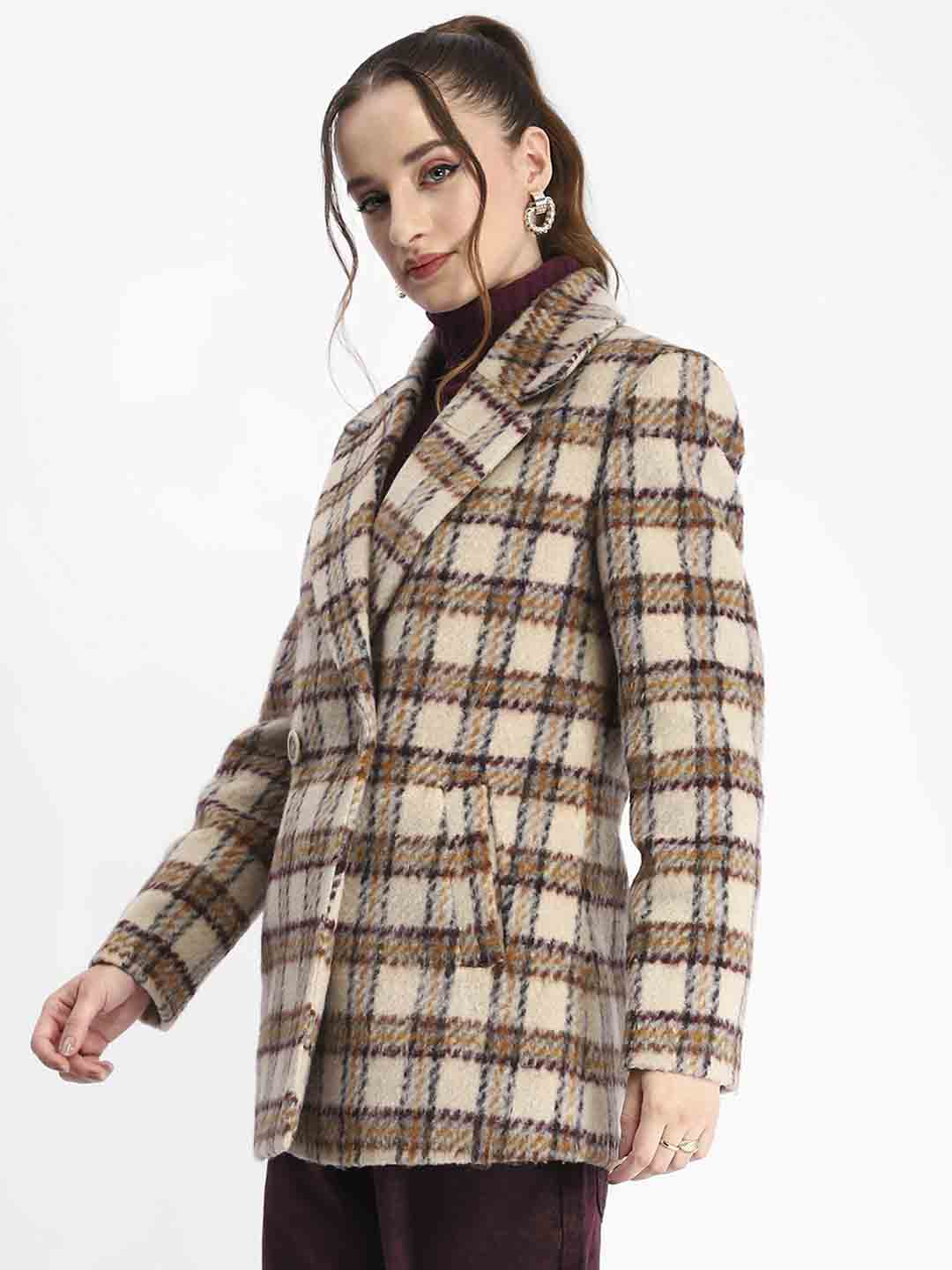 Madame Plaid Lapel Collared Welt Pocketed Beige Coat