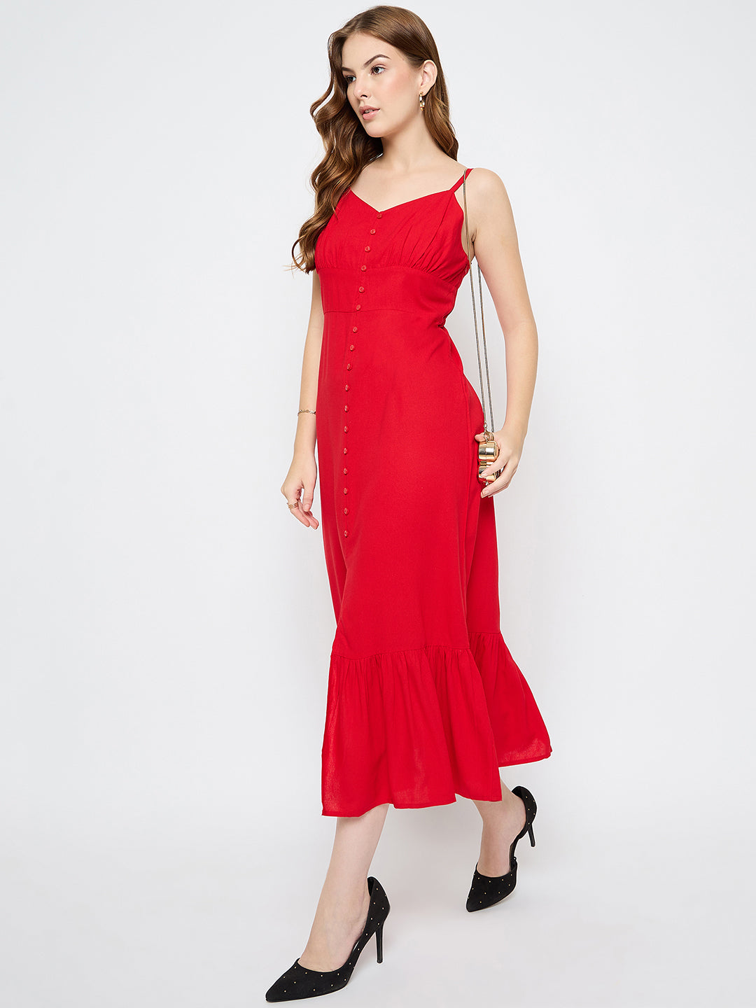 A sleeveless silhouette in striking red flows with bold tiers. Bringing a charming effect, in this dress every step feels like a statement.