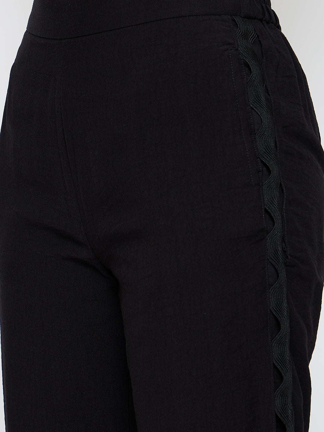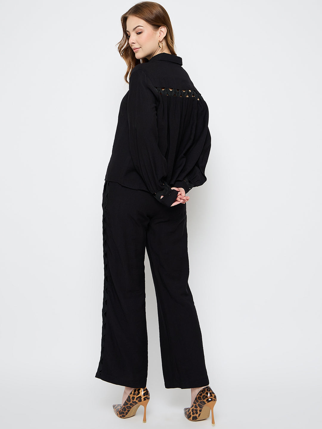 Elegant black with intricate lace and tailored bottoms. It features a sleek coordination that combines delicate detailing.
