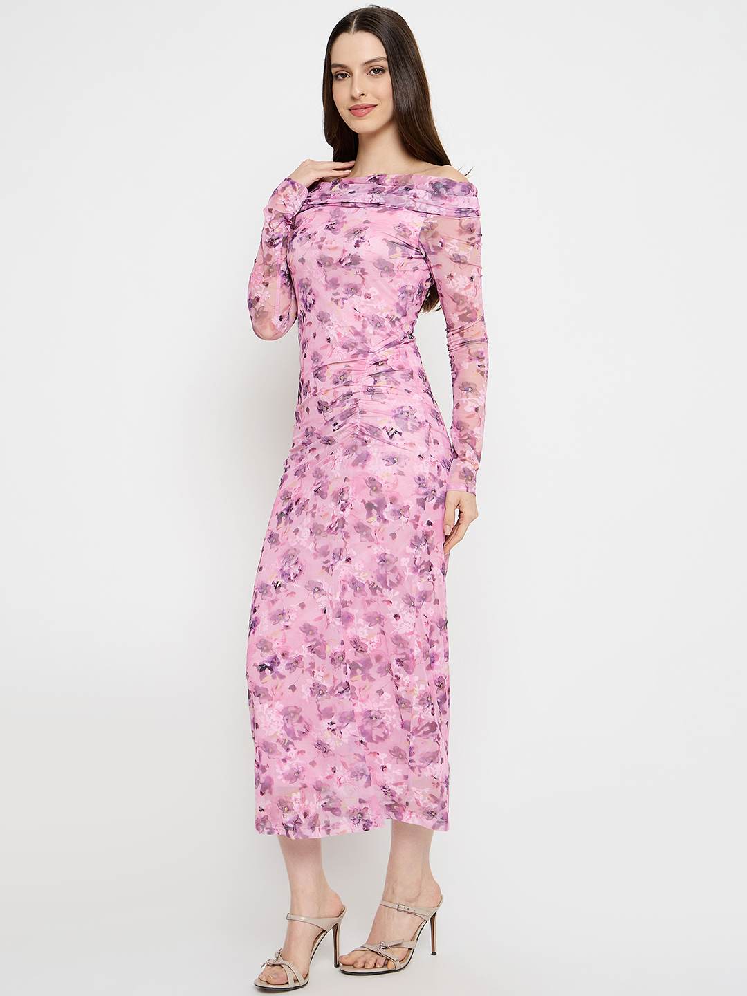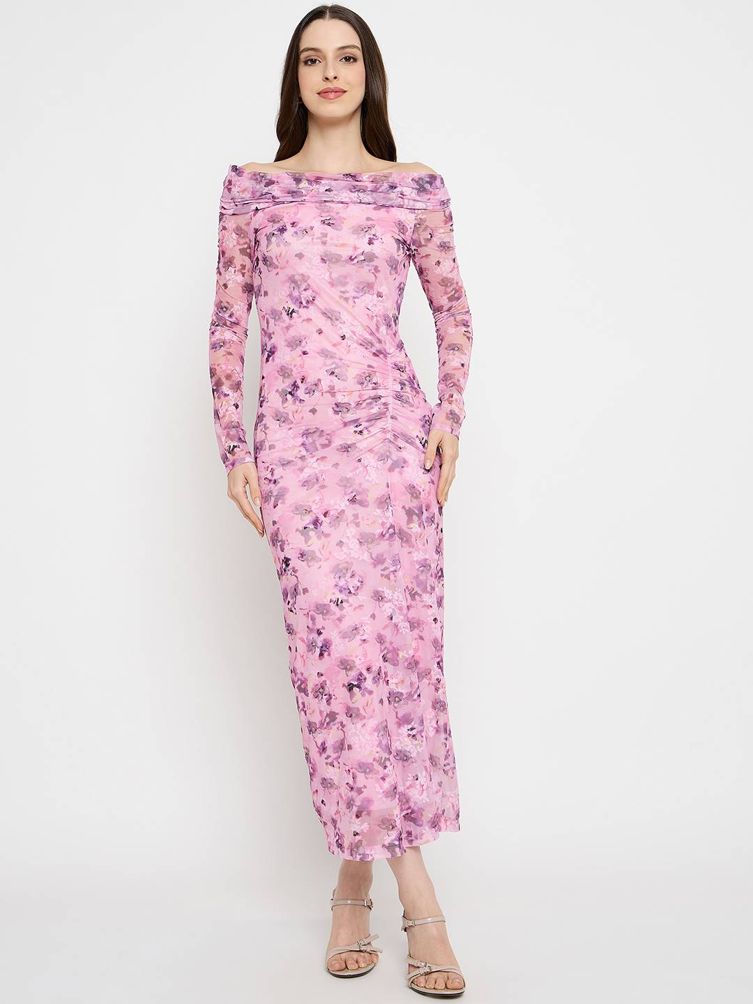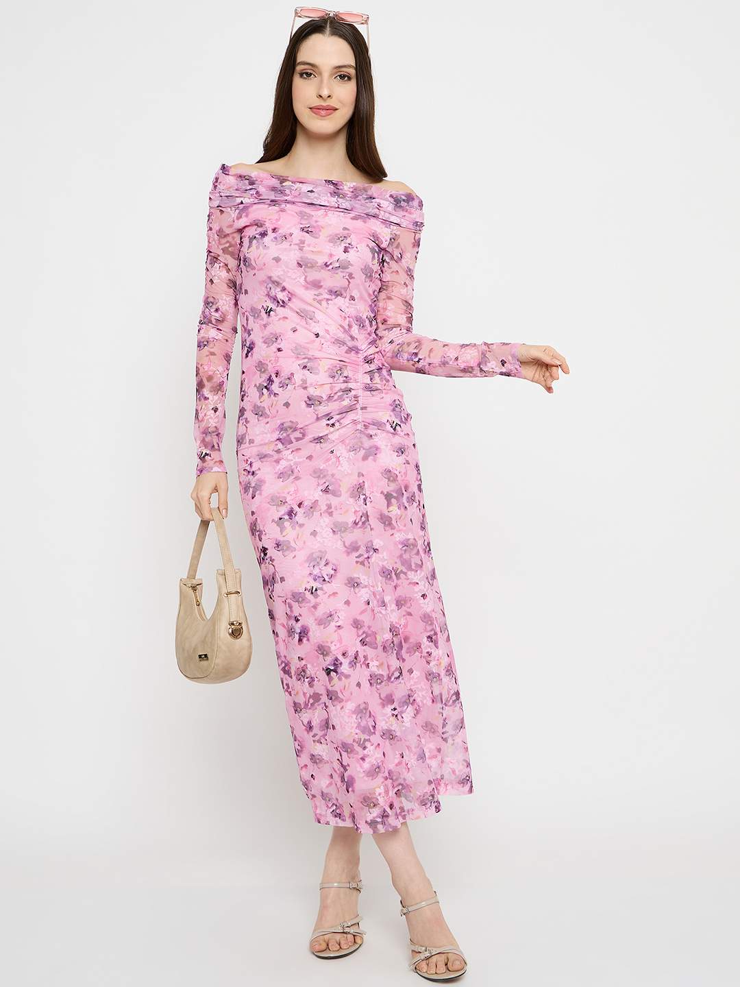 Madame Floral Print Off Shoulder Pink Maxi Dress