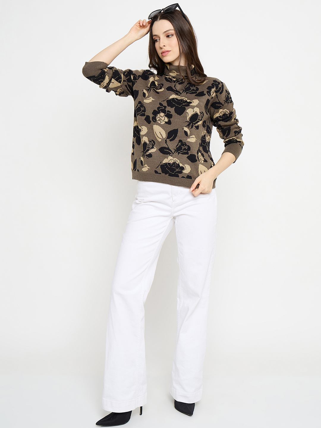 This olive-green layer turns up the heat with its cozy turtleneck, textured knit, and floral patterns. It brings on that bring a feminine twist to winter days.