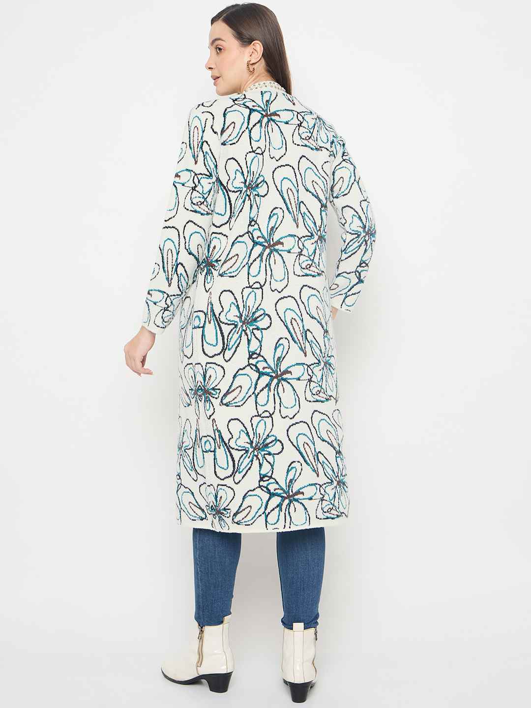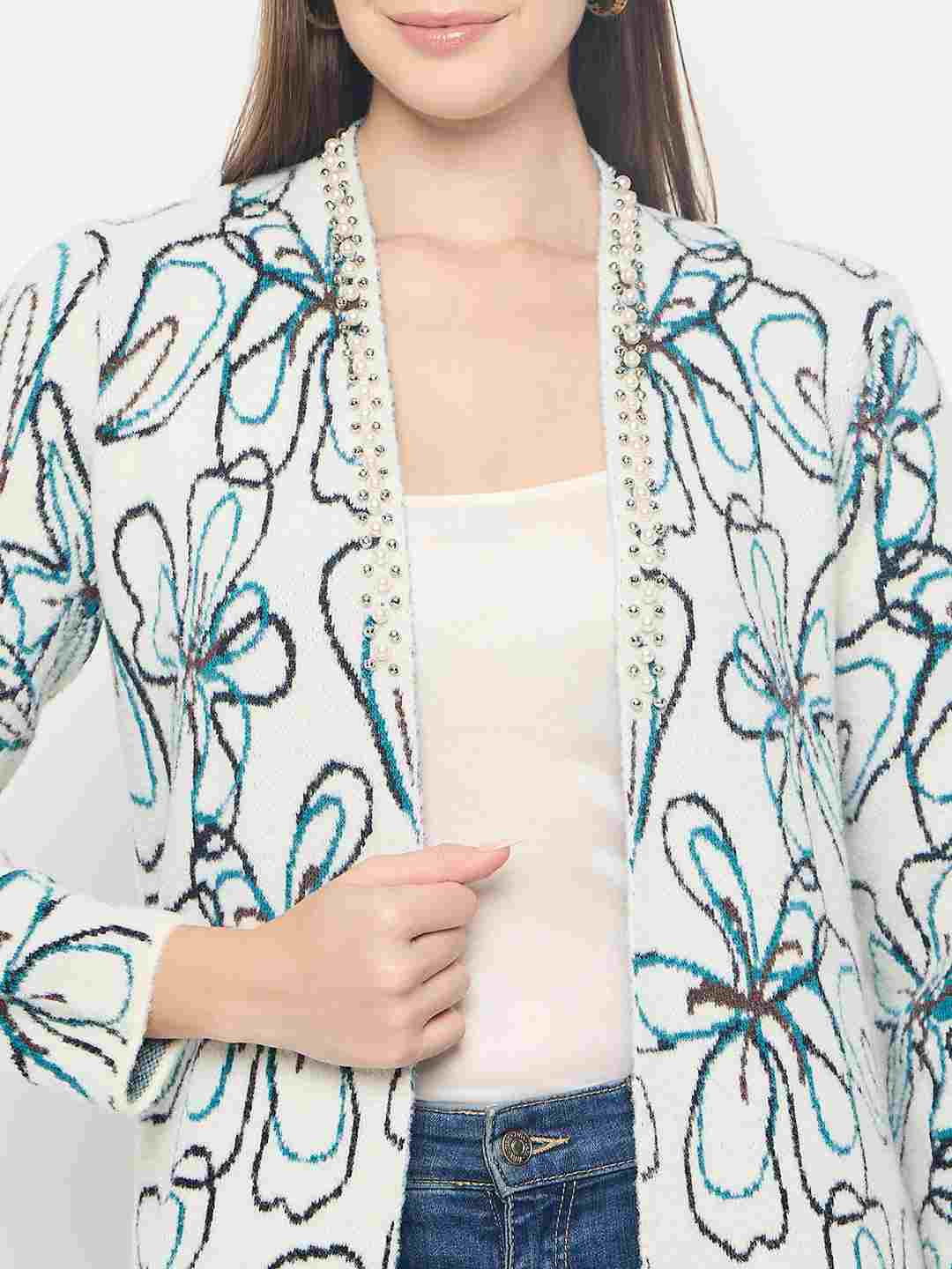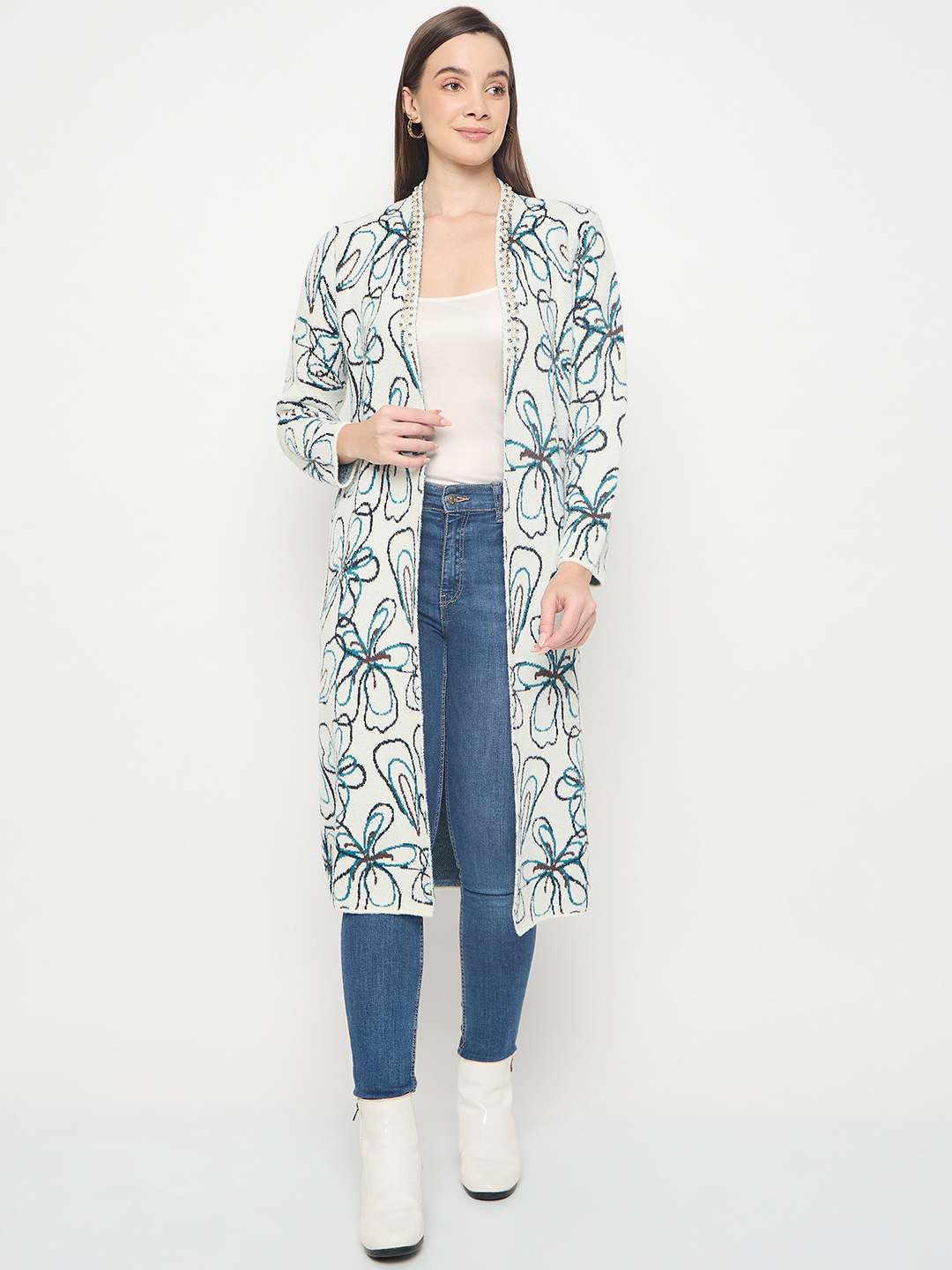 Draped in vibrant floral and pearl embellishments, this long open shrug adds the right dose of color and charm. It is breezy enough for day strolls, yet striking enough for evening plans.