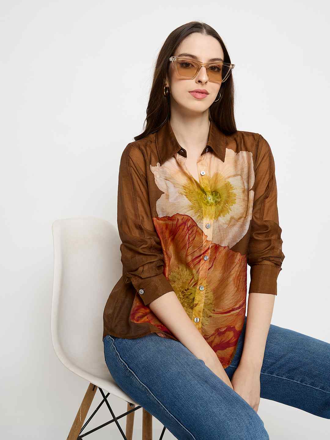 Tailored from a breathable Tencel blend, this brown button-up showcases a delicate floral print. It offers lightweight comfort and refined charm for any season.